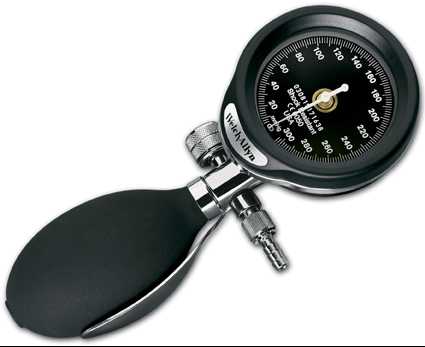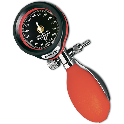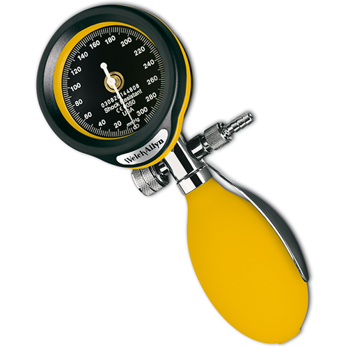 Welch-Allyn aneroïde bloeddrukmeter Silver line DS 55 met enkele uitgang & lepel aan de peer. Lasergegraveerde wijzerplaat verzekert een nauwkeurige aflezing. Schokresistent model. Geleverd met Flexiport-manchette en opbergétui.