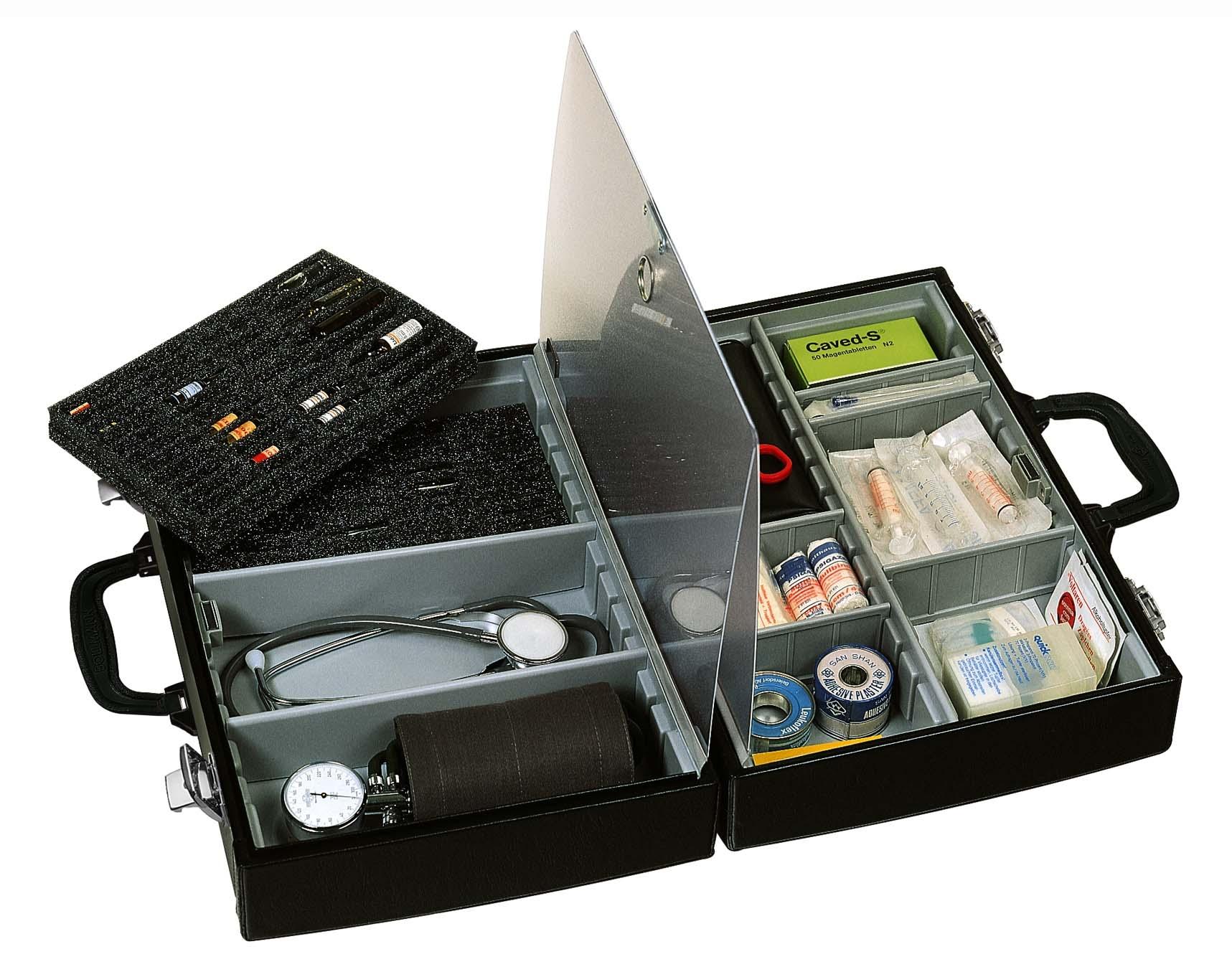 Dokterstas met mooi en praktisch ontwerp. Opent gemakkelijk, dus inhoud makkelijk toegankelijk. Vervaardigd uit krasbestendig leder. Binnenconfiguratie: Twee transparante tussenschotten met magneetsluiting ter bescherming van inhoud, twee compartimenten van hard plastic met zelf in te delen vakken.Twee schuimrubberen ampullenhouders voor een totaal van 74 ampullen.