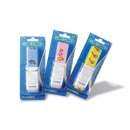Garrot Clipcomed voor kinderen: in wasbare stof en met plastic slot. Het speelse lint is elastisch en bedrukt met kinderfiguurtjes. Autoclaveerbaar model, dat gemakkelijk is aan te brengen en eenvoudig met 1 hand kan worden gebruikt.