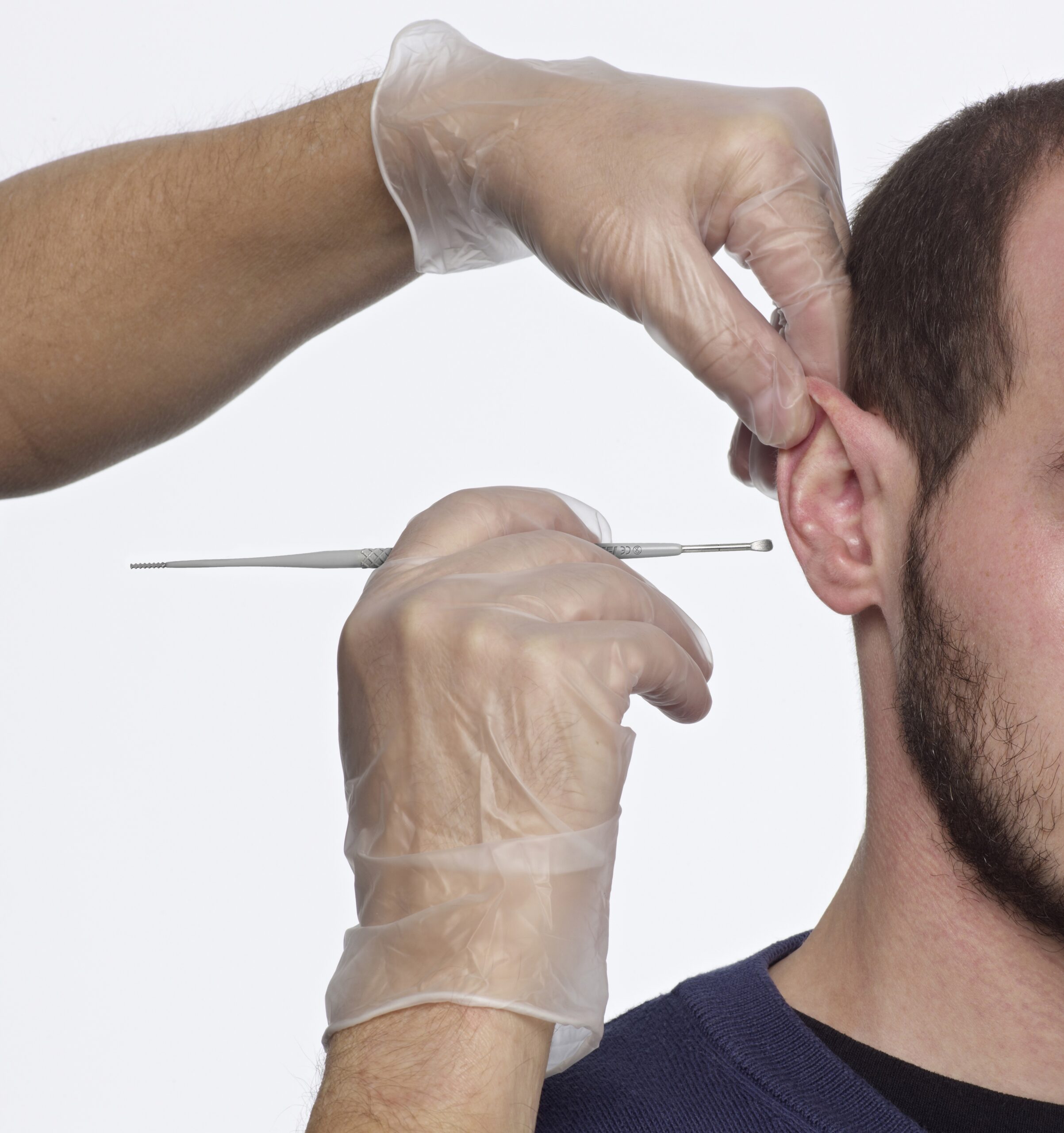 Ergonomisch handvat met ontgrendelhendel om disposabele oortips makkelijk te verwijderen