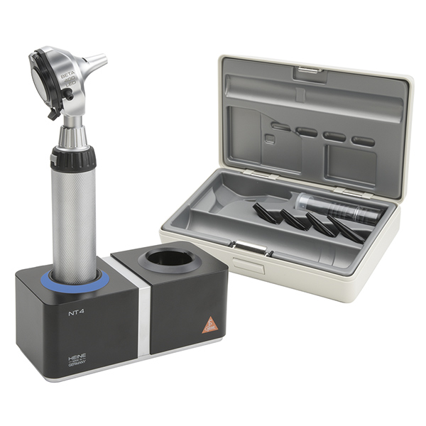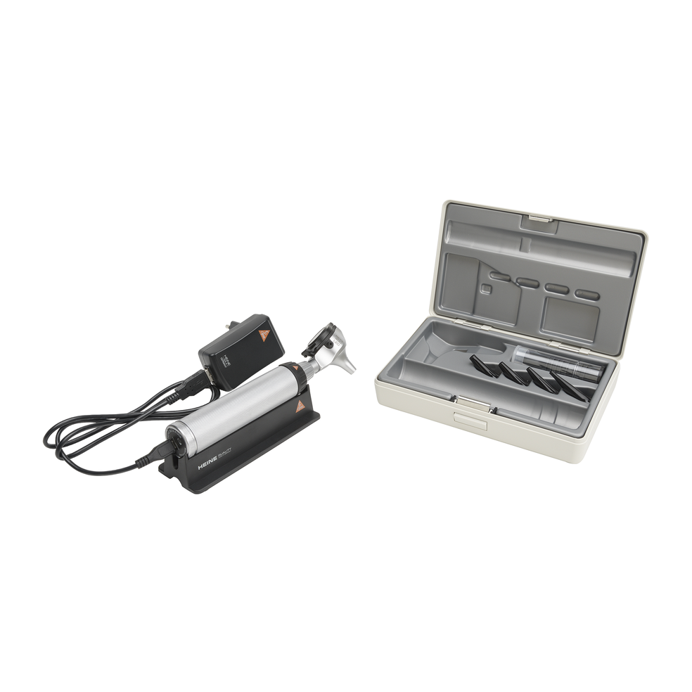 Otoscoopset bestaande uit een Heine BETA 400 F.O otoscoopkop met oplaadbaar USB handvat en LED HQ verlichting en 10 disposable oorspecula (5x 2.5 mm en 5x 4 mm)
