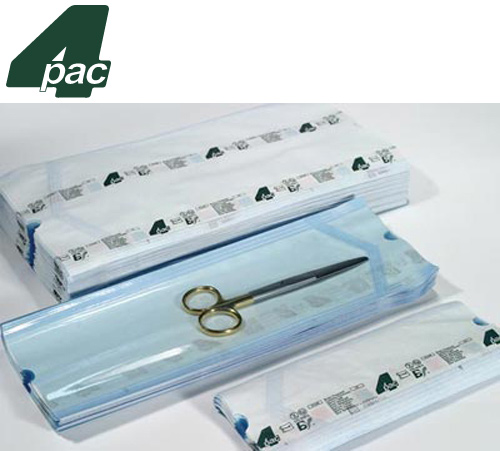 Autoclaafzakjes – zonder vouw, met indicator, type 4-Pac. Gemaakt uit papier van medisch kwaliteit, polyester en polypropyleen gelamineerde film, blauw. “V”-vormige afdichting en opentreklipje voor makkelijk losmaken. Zakjes zijn bedrukt met stoom-en ETO-indicatoren.