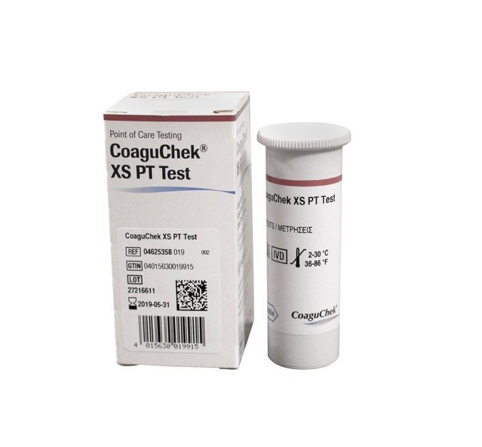 Eveneens leverbaar: CoaguChek XS teststrips; flacon à 24 suks