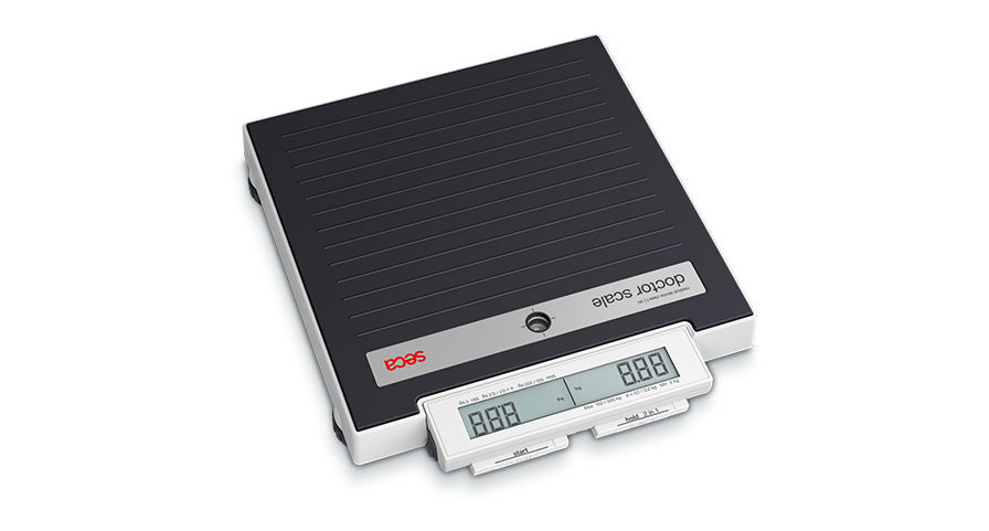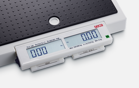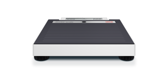 Robuuste opstapweegschaal, plat model. Met gebruiksvriendelijke dubbele LCD-scherm dat tegelijkertijd door de arts en de patiënt kan worden afgelezen. Met voetbediende aan/uit-schakelaar.  Kinderen wegen wordt vereenvoudigd door de moeder/kind-functie te activeren.