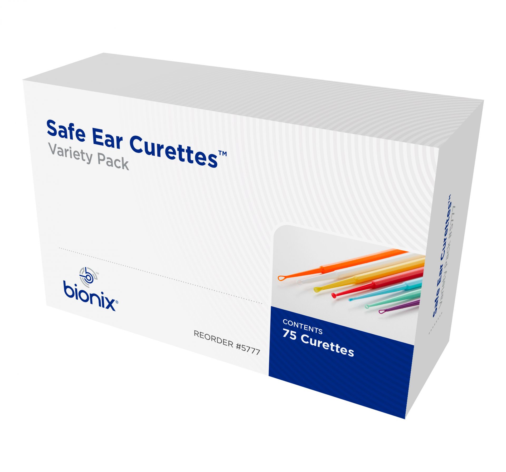 Ref. I5.5777 – Disposable Safe Ear Curettes Variety-Pack: assortiment van de 7 soorten curettes: 10 stks groen + 10 stks oranje + 10 stks rood + 10 stks paars + 10 stks blauw + 10 stks geel + 15 stks wit; doos à 75 stuks