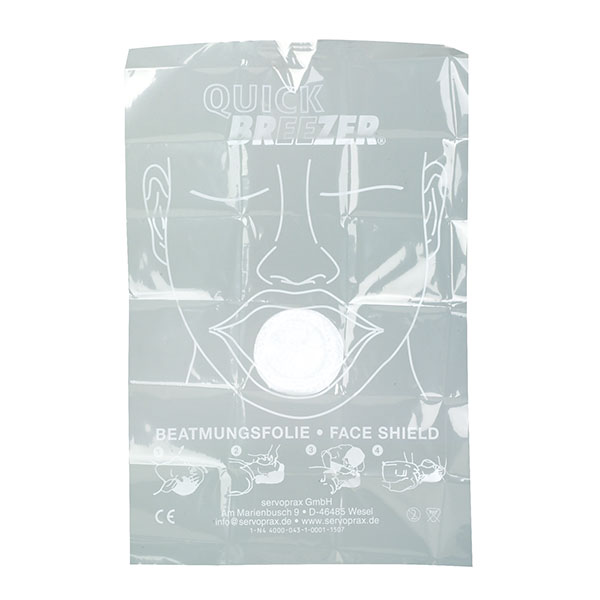 Beademingsfolie in aluminium blister, zonder mondstuk. Zeer plaatsbesparend voor in EHBO-koffers en EHBO-tassen. Gebruiksaanwijzing wordt vermeld op het masker.