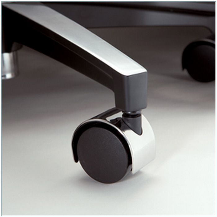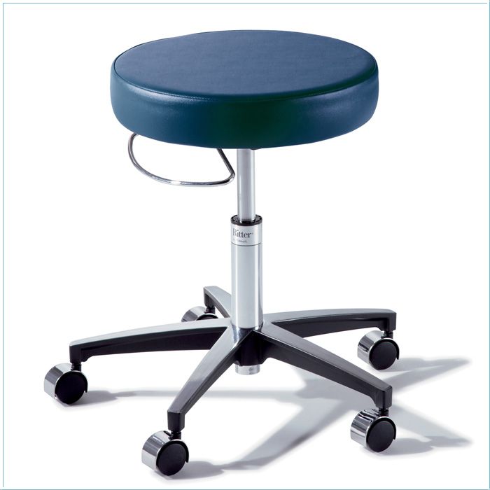 Tabouret gemonteerd op 5-armige voet op zwenkwieltjes; geeft optimaal comfort en stabiliteit