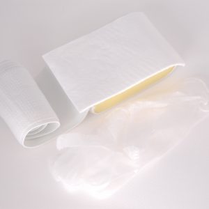 Bloedstelpend steriel drukverband : blister met 1 elastisch verband 108 x 9 cm met velcrosluiting, mousse 12 x 10 x 2,6 cm, niet-klevend wondverband 10 x 15cm en 1 paar vinyl handschoenen maat Large