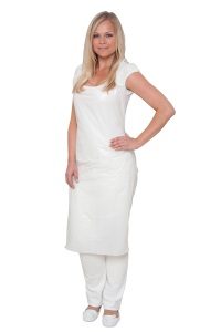 Eenvoudige witte voorhangschorten in PVC; disposable. Met bindlinten in de taille.