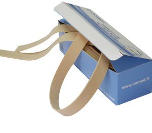 Garrot plat model, niet tubulair, bevat latex. Kleur: beige. Niet steriel. Afm.: 750 x 18 x 1,5 mm. Doos à 25 stuks (eveneens per stuk leverbaar)