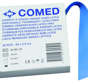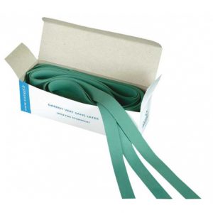 Garrot latexvrij; plat model vervaardigd uit isopreen, in groene kleur, zeer lichtjes gepoederd. Niet steriel. Afm.: 750 x 18 x 1 mm. Doos à 25 stuks (eveneens per stuk leverbaar)