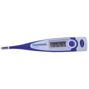 De Thermoval Kids Flex thermometer is uitgerust met een flexibele meetpunt en een extra groot LCD displayHet display toont de gemeten temperatuur in °C en de status van de batterijen. De thermometer is uitgerust met een geluidsignaal, een automatische start/stop functie en een geheugenfunctie met de laatst gemeten waarde.De thermometer werkt met een batterij van lange levensduur en is waterdicht.Bereik van de thermometer: 32°C – 43,9°CDe Thermoval kids flex meet de lichaamstemperatuur binnen de volgende tijden :