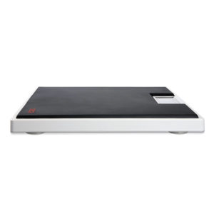 Digitale platte weegschaal met groot, gemakkelijk afleesbare LCD-display, gemakkelijke opstap en automatische uitschakeling. Uitgerust met transportwielen. Erg energiezuinig en robuust (kan zwaarlijvige gebruikers aan)