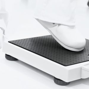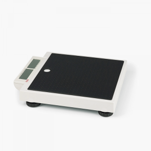 Robuuste opstapweegschaal, plat model. Met gebruiksvriendelijke dubbele LCD-scherm dat tegelijkertijd door de arts en de patiënt kan worden afgelezen. Met voetbediende aan/uit-schakelaar. Kinderen wegen wordt vereenvoudigd door de moeder/kind-functie te activeren.