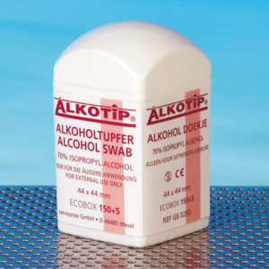 Alcoolswabs voor huidontsmetting; handig verpakt in hardplastic dispenserdoosje per 150 + 5 stuks