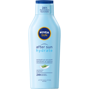 De verkoelende en kalmerende Nivea After Sun Hydrate Lotion trekt snel in en hydrateert de huid intensief gedurende 24 uur. Het regelmatig gebruik na blootstelling aan de zon verhoogt de vochtbalans van de huid en zorgt voor een zijdezacht gevoel. Bovendien behoudt de huid haar elasticiteit. Op basis van Aloë Vera en avocado-olie! De huidvriendelijkheid is dermatologisch getest en goedgekeurd.