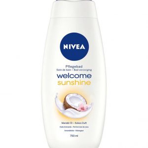 Badschuim NIVEA Welcome Sunshine met verzorgende amandelolie omhult je huid met langdurig zijdezacht en heerlijk weelderig schuim en laat je huid zacht en gehydrateerd aanvoelen. Het tropische kokosparfum verwent je zinnen en maakt van het bad een moment om van te genieten.