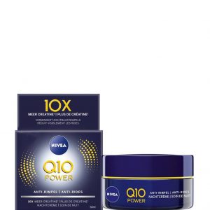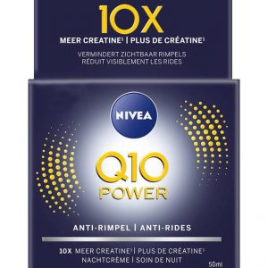 De NIVEA Q10 Power Anti-rimpel Nachtcrème vermindert de zichtbaarheid van rimpels en herstelt de huid gedurende de nacht – wanneer de huid meer open staat voor vochtopname. De nieuwe intensief verzorgende formule hydrateert en herstelt en voedt de huid intensief gedurende de nacht. Zij verhoogt het natuurlijke Q10- en Creatinegehalte gedurende de nacht.