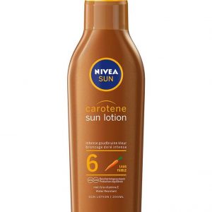 Nivea Sun Carotene zonnemelk, verrijkt met carotene-extracten en Vitamine E, geeft de huid een goudkleurig en langdurig gebruind effect. De hydraterende formule voedt de huid zodat de huid langer bruin blijft. De huid is beschermd tegen vroegtijdige huidveroudering en voelt zijdezacht aan.