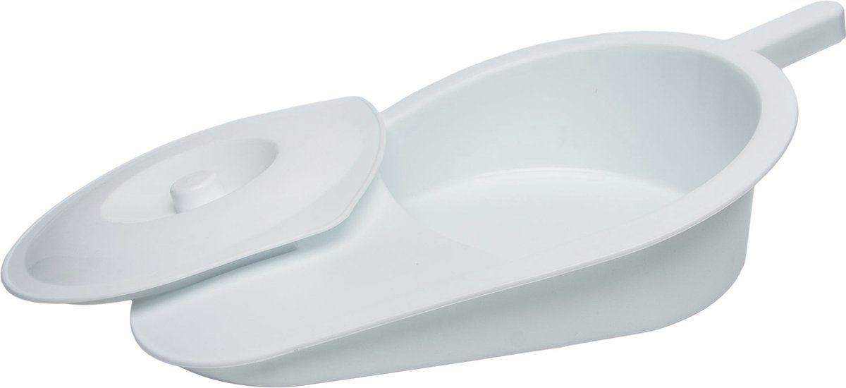 Bedpan plastic schupmodel. Met schuin aflopende voorzijde zodat de bedpan eenvoudig onder de billen kan worden geschoven. Voorzien van een handvat, wat het schuiven onder de bedlegerige én het ledigen nadien eenvoudiger maakt.