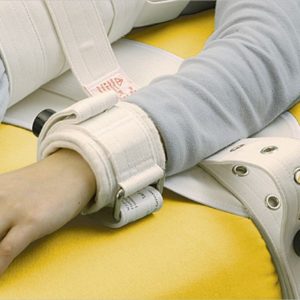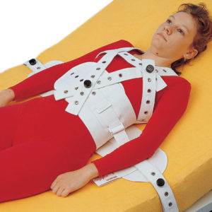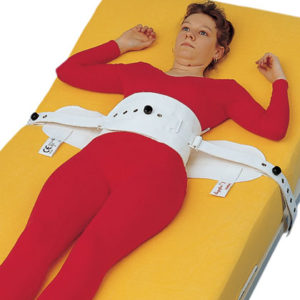Buikgordel met snelsluiting achteraan, dus achter leuning van (rol)stoel vast te maken om manupilaties van de patiënt te verhinderen.