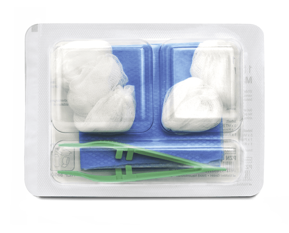 Ref. 55014: Omvat: blister met 3 compartimenten, 5 gaasdeppers, 1 plastic blauw pincet, 1 geplastificeerd veld 38*45 cm