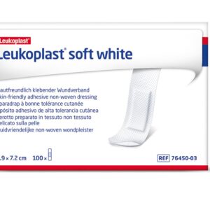 Huidvriendelijke, hypo-allergene pleister met een niet-klevend compres. Leukoplast Soft white is zeer lucht- en waterdamp doorlatend, waardoor hij zeer geschikt voor patiënten met een gevoelige huidToepassingen: hygiënische afdekken van kleine wondjes, schrammen, enz. Eveneens geschikt voor afdekken van de injectieplaats na vaccinatie of bloedafname.