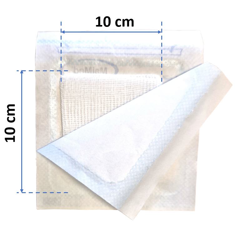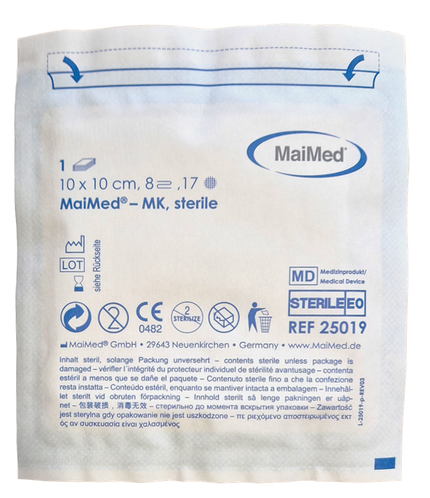 Steriele compressen 10 x 10 cm, individueel per stuk verpakt; 8-lagig. Met ingeslagen knipkant. Voor uitwendige wondverzorging