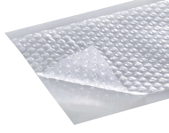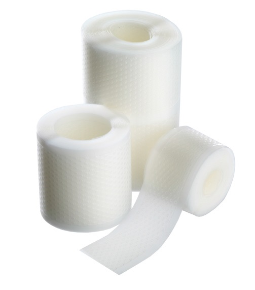 Dun, ademend, waterdicht en transparant folieverband op rol met siliconen kleeflaag, dat geschikt is voor gebruik bij personen met een kwetsbare huid