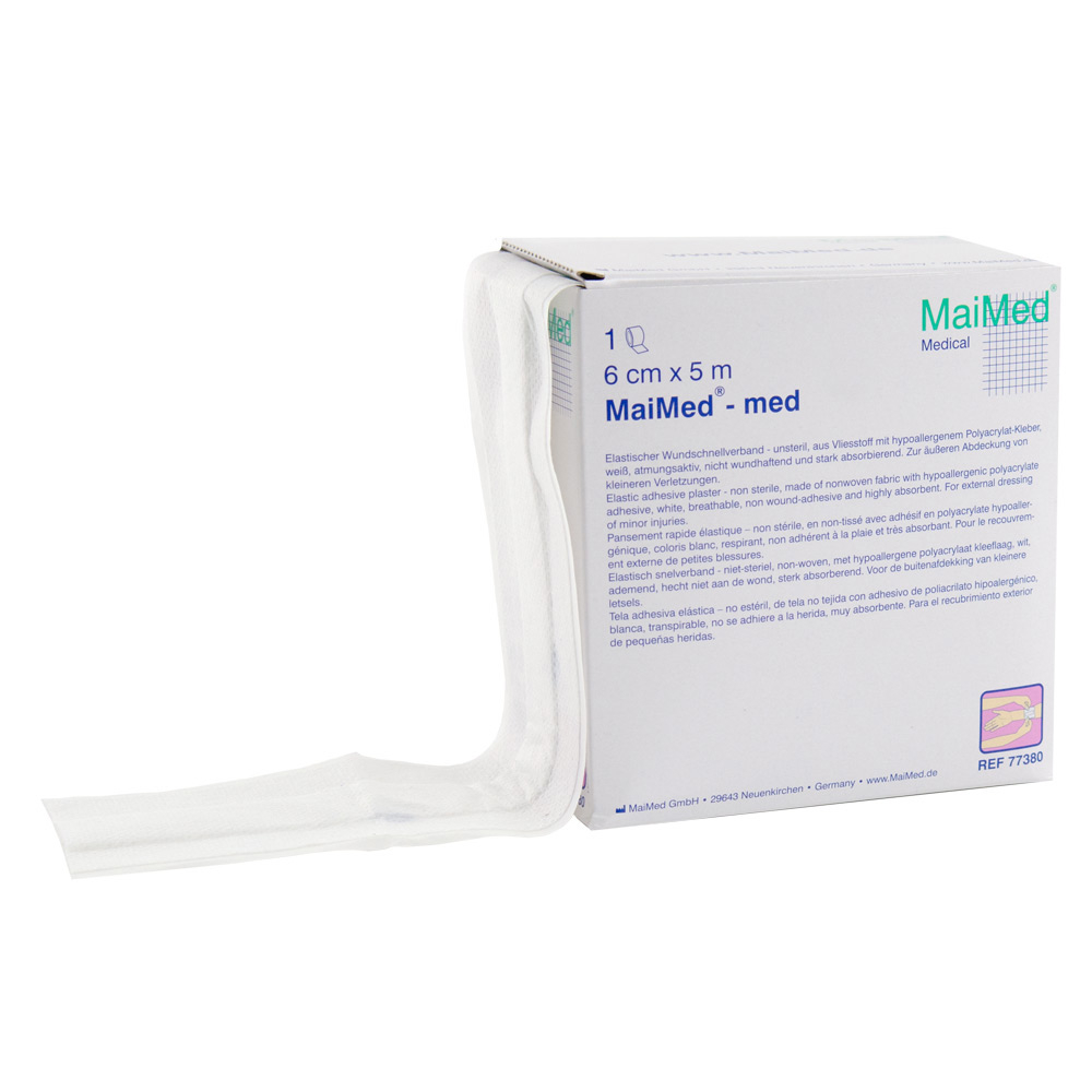 MaiMed Med: non-woven snelverband, hypo-allergisch en ademend, kleeft niet aan de wond. Voor de bedekking van kleinere letsels